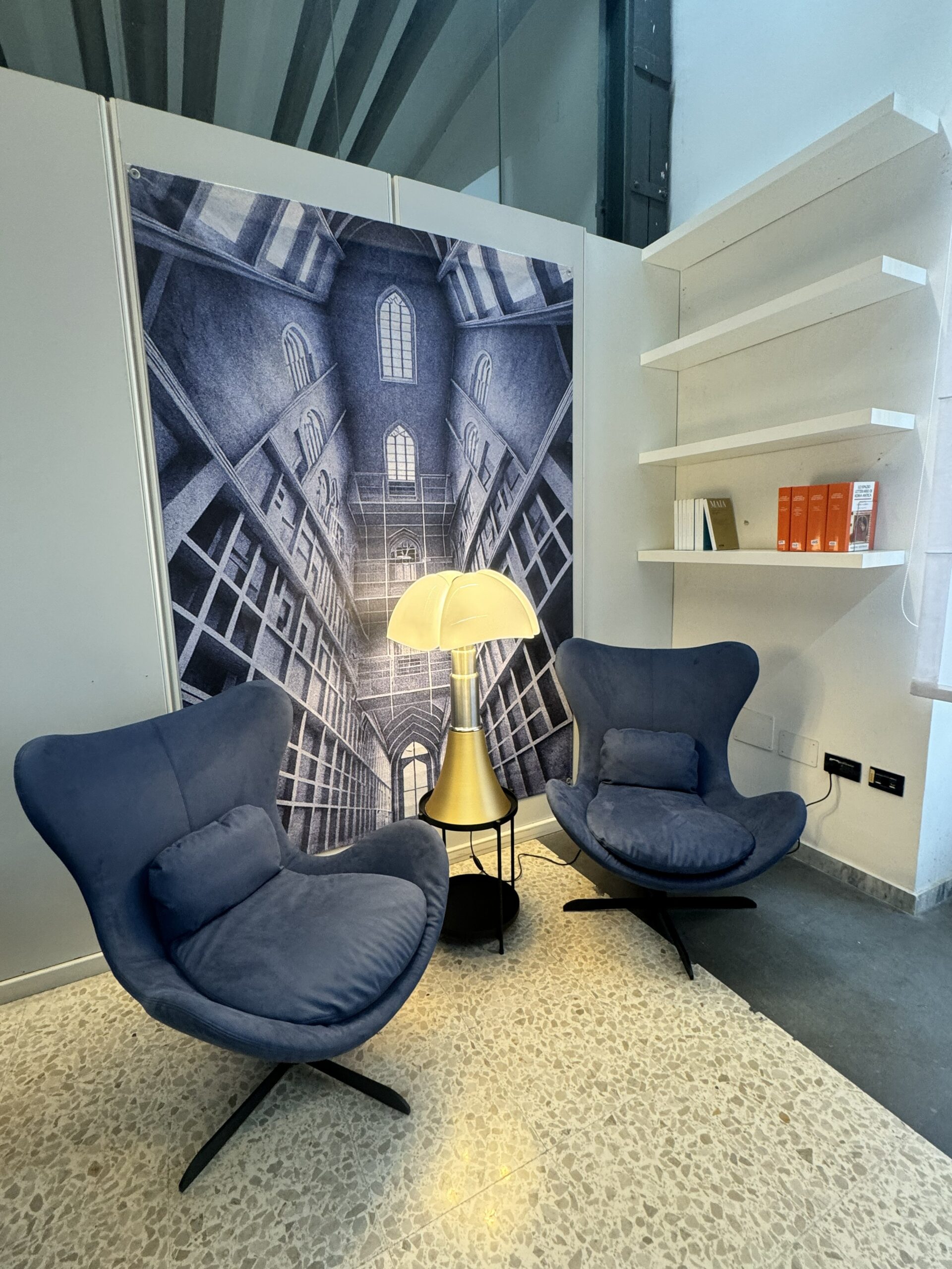 - Illuminazione d’autore: La presenza della lampada Pipistrello (Martinelli Luce) e della Tolomeo (Artemide) assicura una luce tecnica perfetta per la lettura, conferendo al contempo un carattere prestigioso all’ambiente.