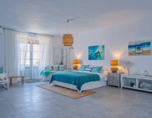 Evocando le isole greche o baleari, le pareti bianche creano un senso di evasione, con tocchi di blu o verde per un legame con la natura. Ottimo per case vacanze o ambienti relax.
